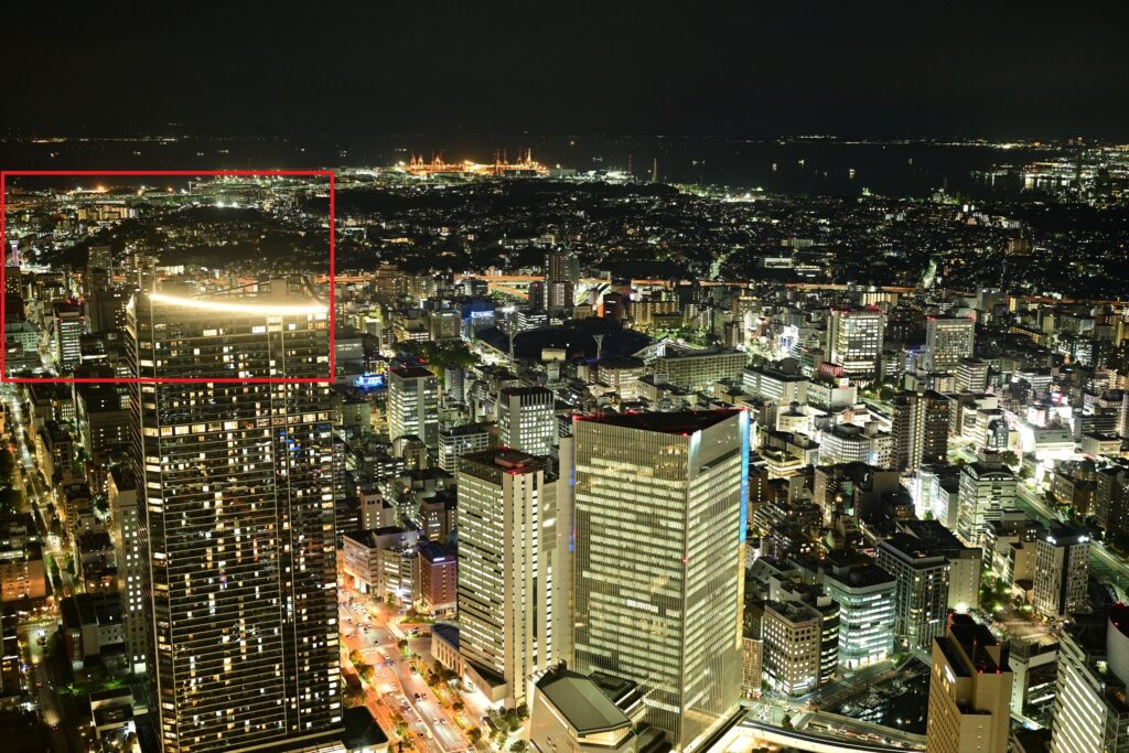 日が暮れたタイミングで一周したところ。前回シグマ40mm F1.4で撮った時と同様、ISO2500、絞り1.4くらいで撮っている。横浜市役所・スタジアム方面は明るいのでISOや絞りを一段下げる余力があり、若干画質が改善しているかもしれない。