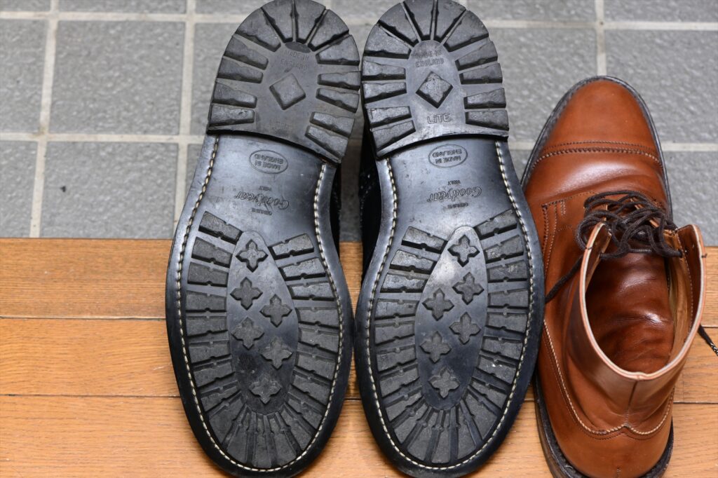 この個体についてはコマンドソールが付いていた。筆者手持ちのネイビーと同じで、耐久性が高くヘビーユースに適した仕様といえる。雨にも強いので外をよく歩く人はこれが理想。ダイナイトと違ってヒールの音が静かなのも特徴で実用性が高い。