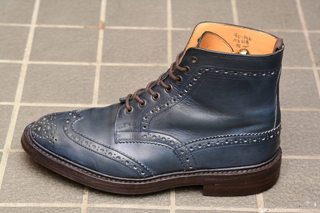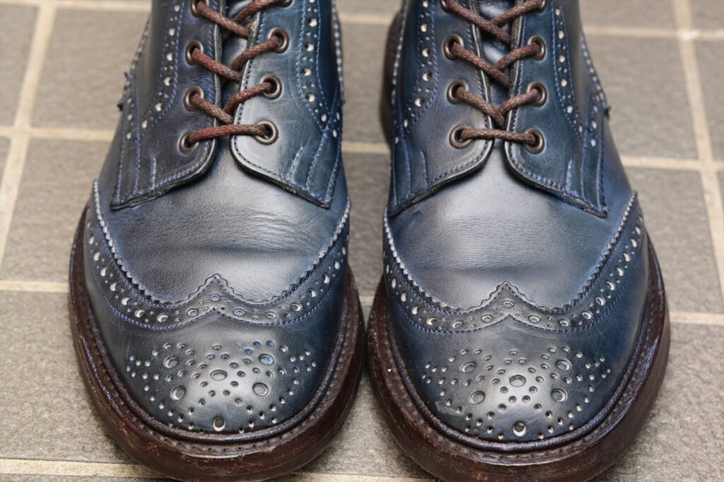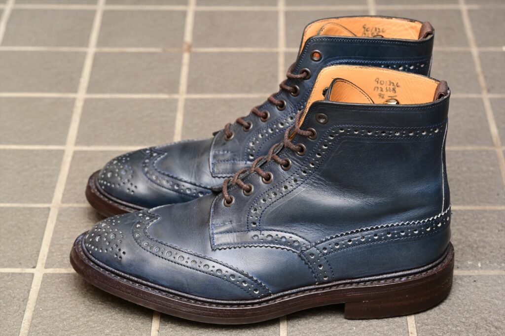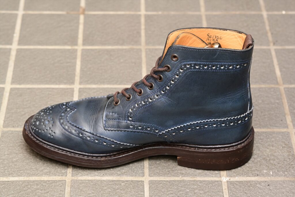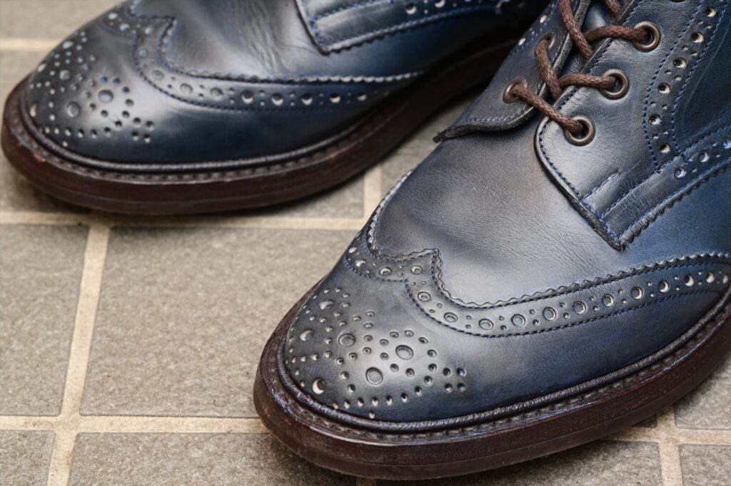 全体像としていつものトリッカーズモールトンになる。ウイングチップのパターンも通常通り。特徴的なのがパリジャンブルーでブルーグリーンといった感じの色合いになる。通常のラインナップにはないレアカラーということになる。