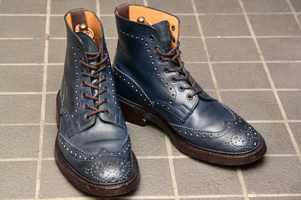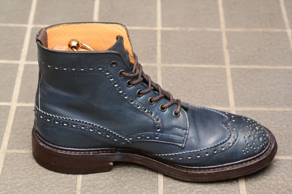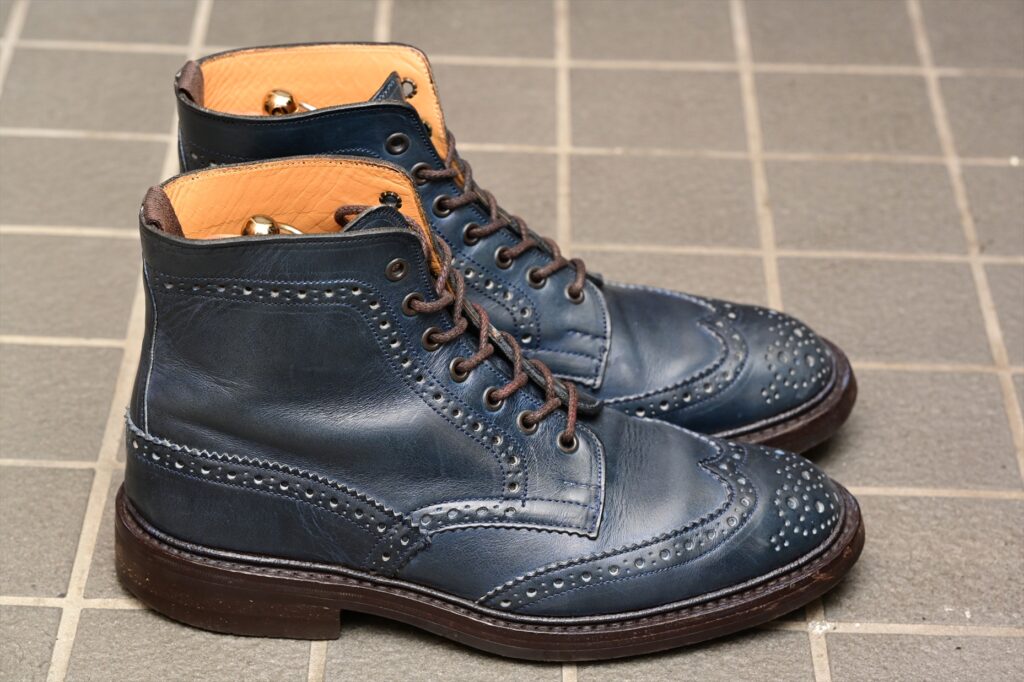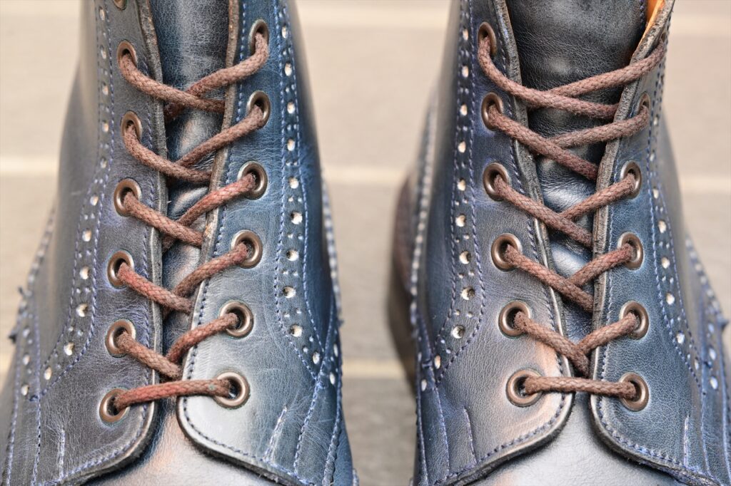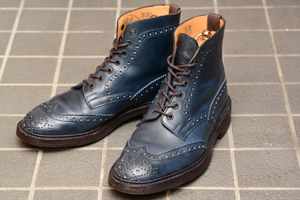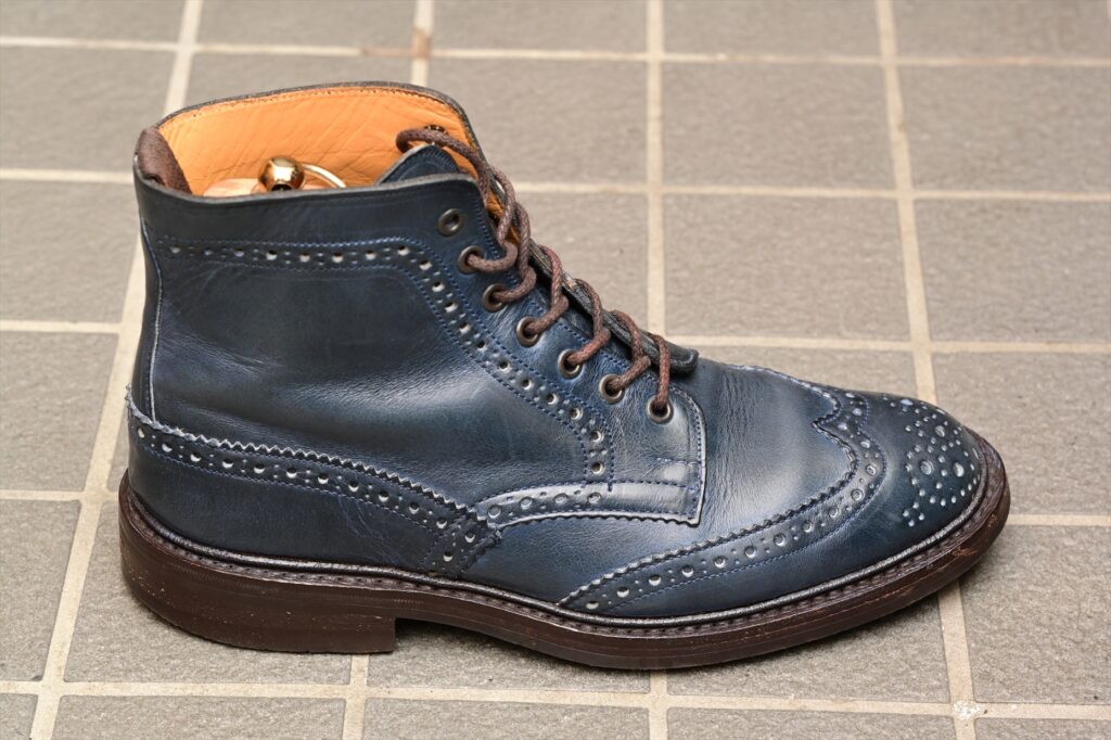 全体像としていつものトリッカーズモールトンになる。ウイングチップのパターンも通常通り。特徴的なのがパリジャンブルーでブルーグリーンといった感じの色合いになる。通常のラインナップにはないレアカラーということになる。