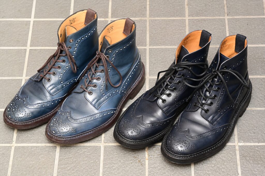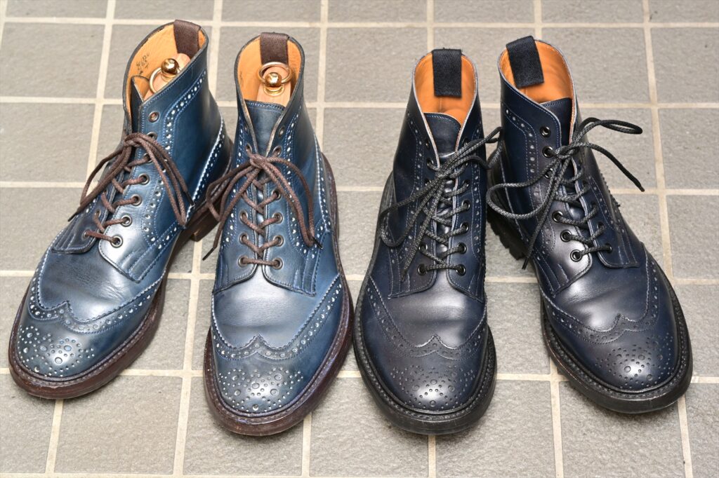 ホワイツ社のセミドレス(クロムエクセル)でネイビーCXというモデルがあって、それを少し青色を強くした感じの色合いかもしれない。またコバはダークブラウンに着色されていてシックな雰囲気に仕上がっている。