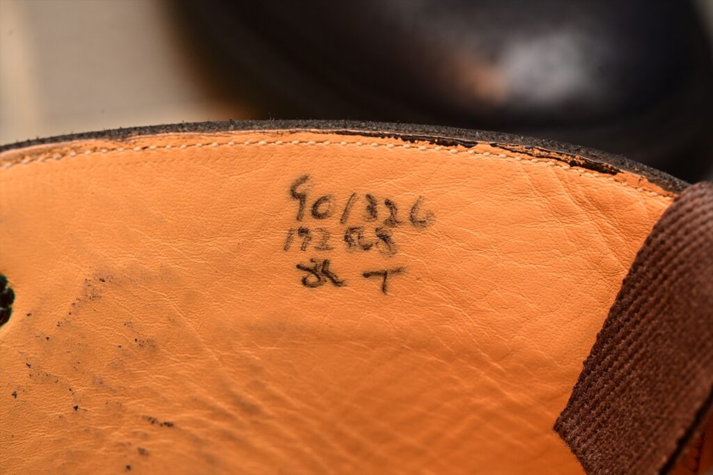 製造番号は90万番台。90年代後半~00年代に作られた物と思われる。サイズは8 1/2で、フィッティングは5となる。初めに購入したネイビーが若干きつかったのでハーフサイズ上げた形だ。