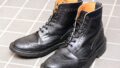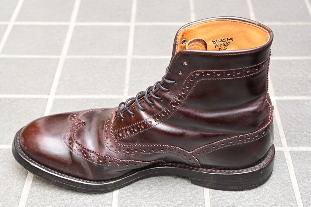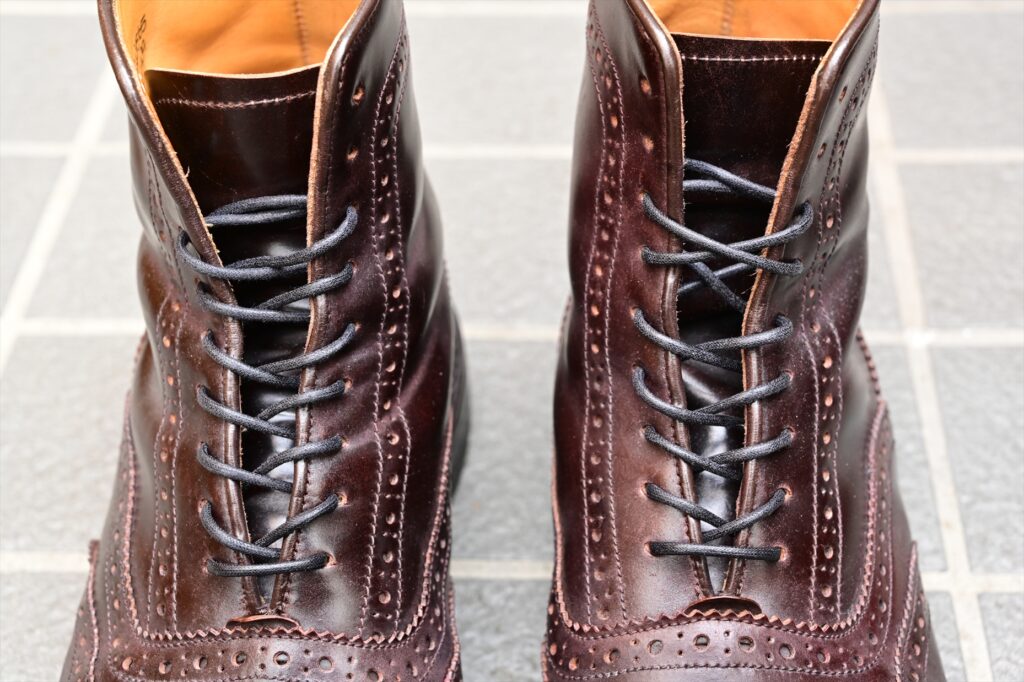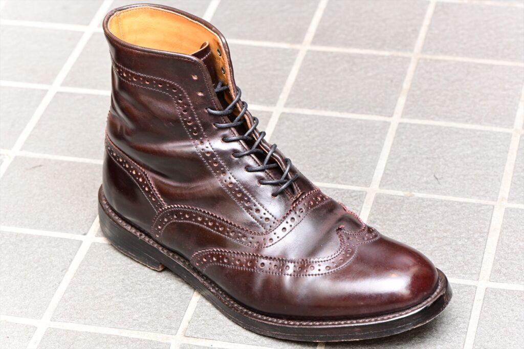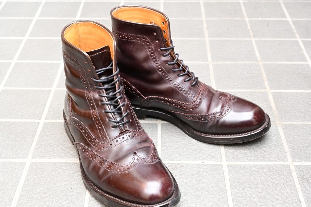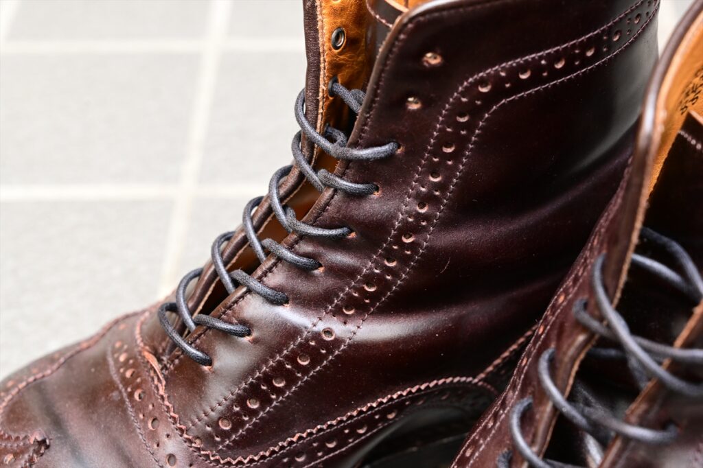 この靴も一見するとオーソドックスなフルブローグのカントリーブーツに見えるが、アッパーレザーが何とコードバンでできている。ディティールも通常のストウやモールトンよりもドレスに振っているため、通常モデルとは異なる風合いを楽しめる。