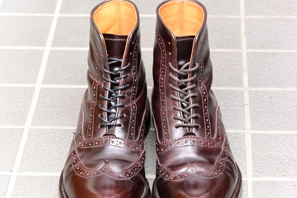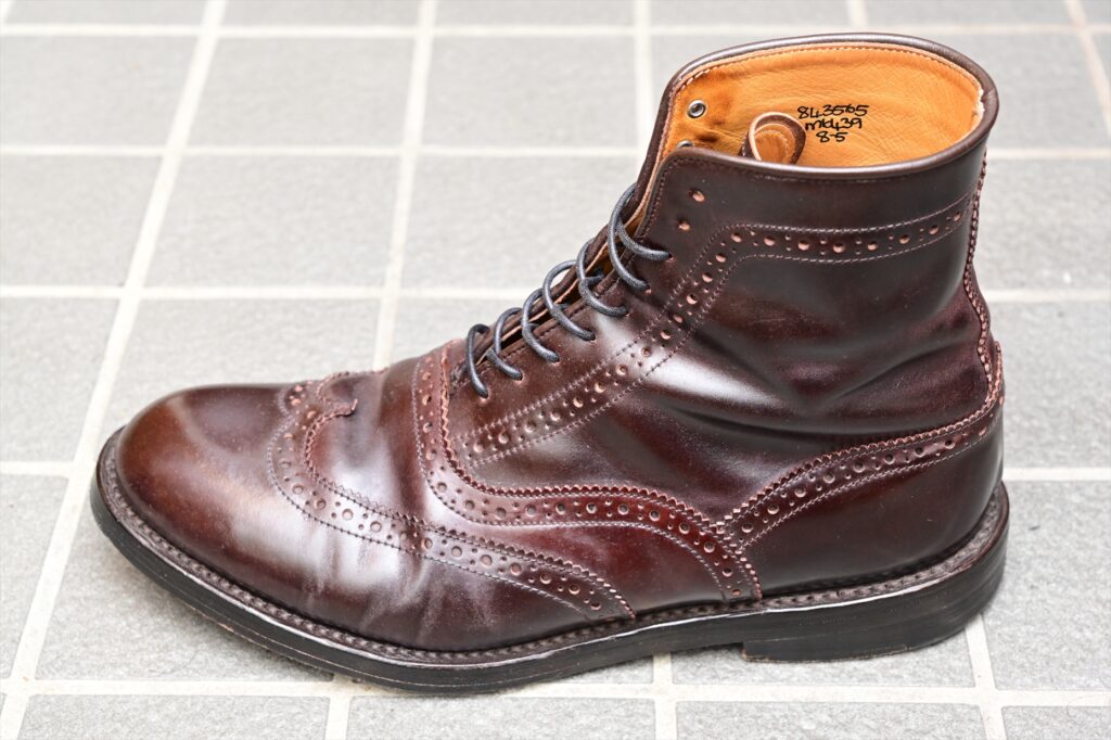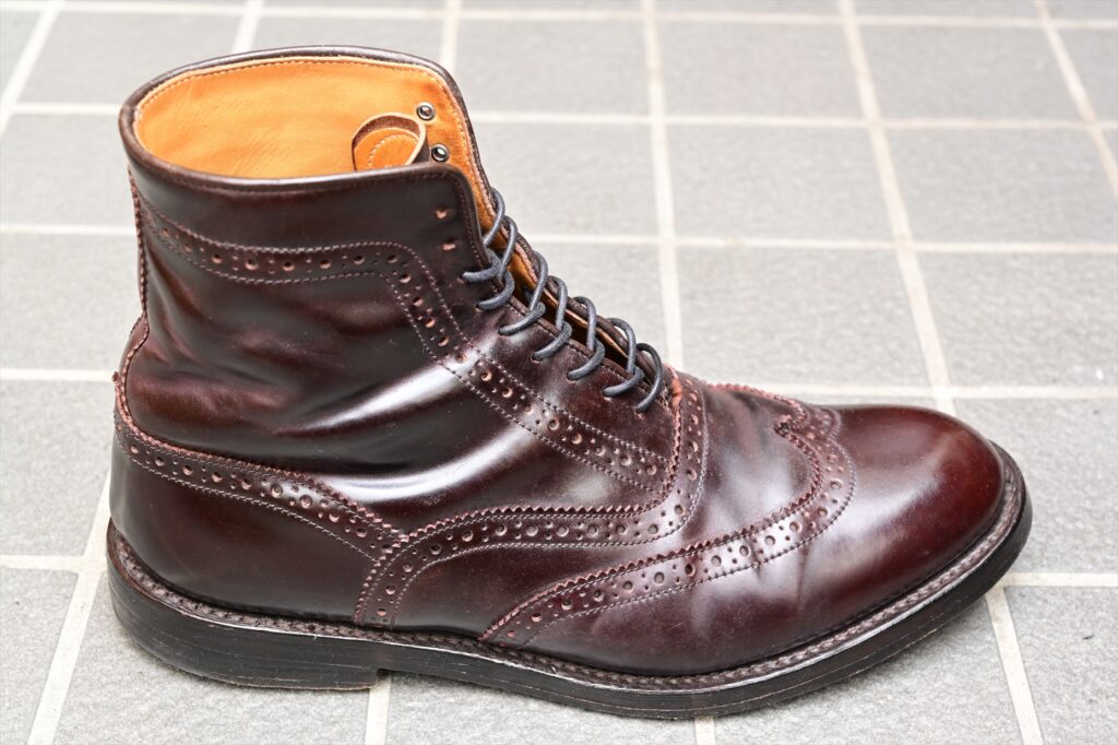 少々寂しい感じもあるが通常のフルブローグよりも上品で、光沢の強いコードバンには合っている。さすがにガラスレザーのような均一な艶とはいかないのだが、コーティングされていないがゆえに履き皺がヒビにならず、小傷であれば磨き直して消せるのはいい。