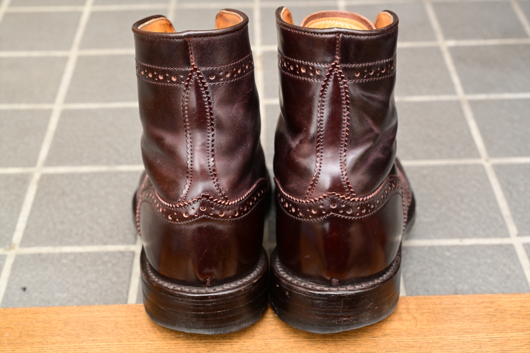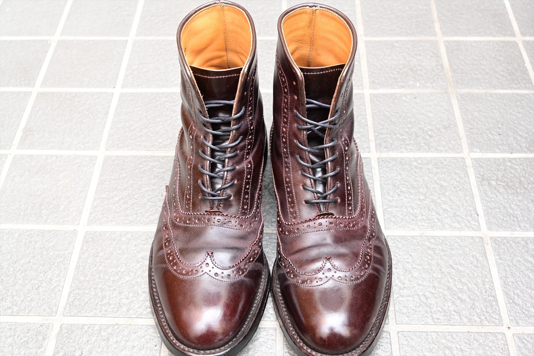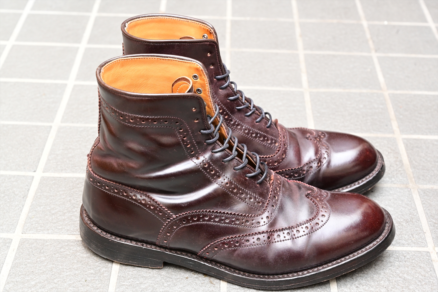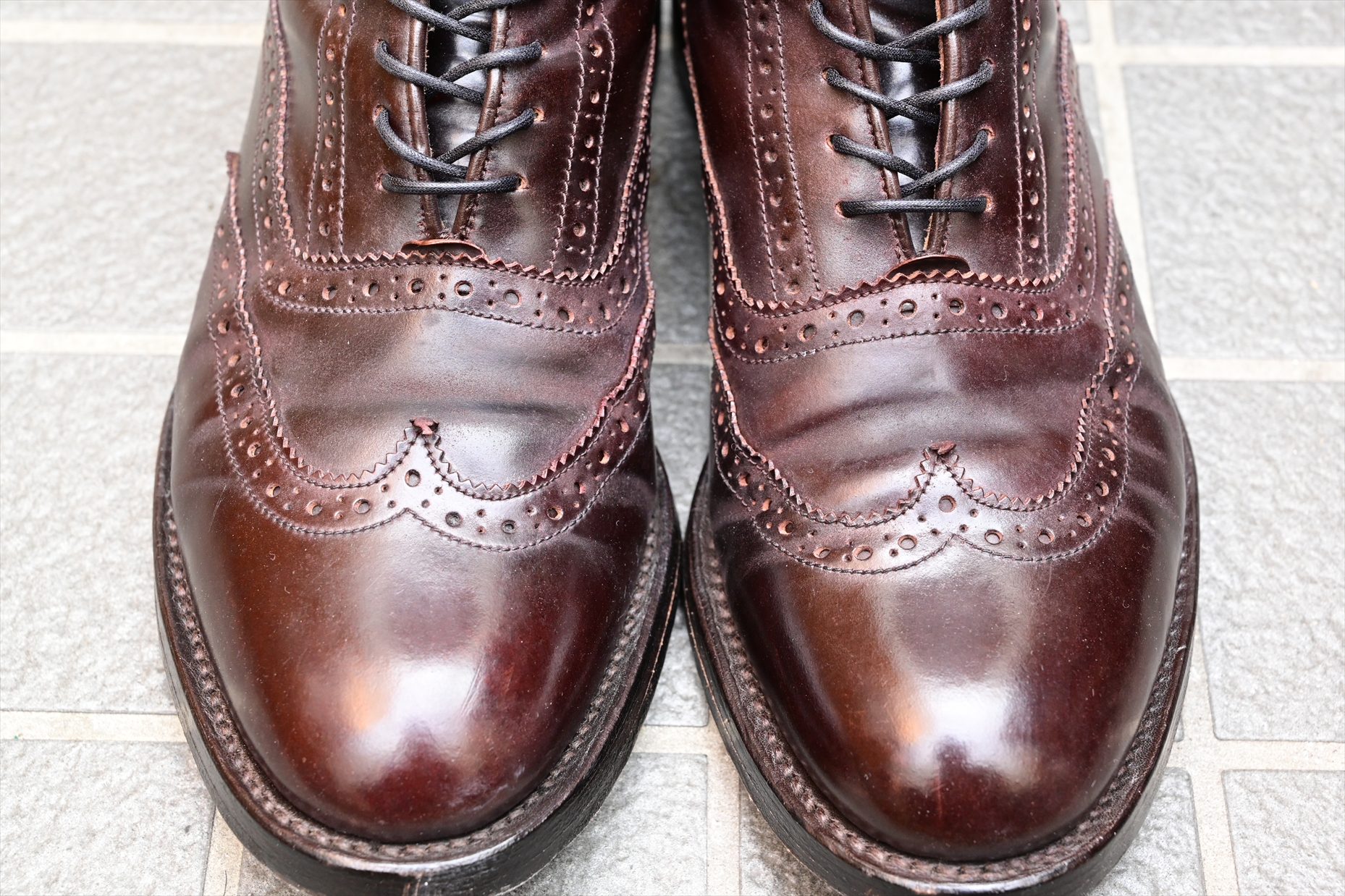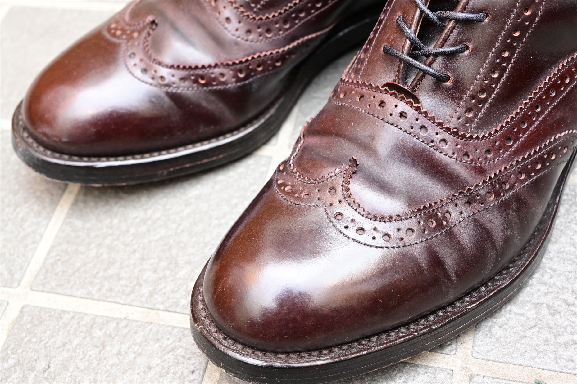 少々寂しい感じもあるが通常のフルブローグよりも上品で、光沢の強いコードバンには合っている。さすがにガラスレザーのような均一な艶とはいかないのだが、コーティングされていないがゆえに履き皺がヒビにならず、小傷であれば磨き直して消せるのはいい。