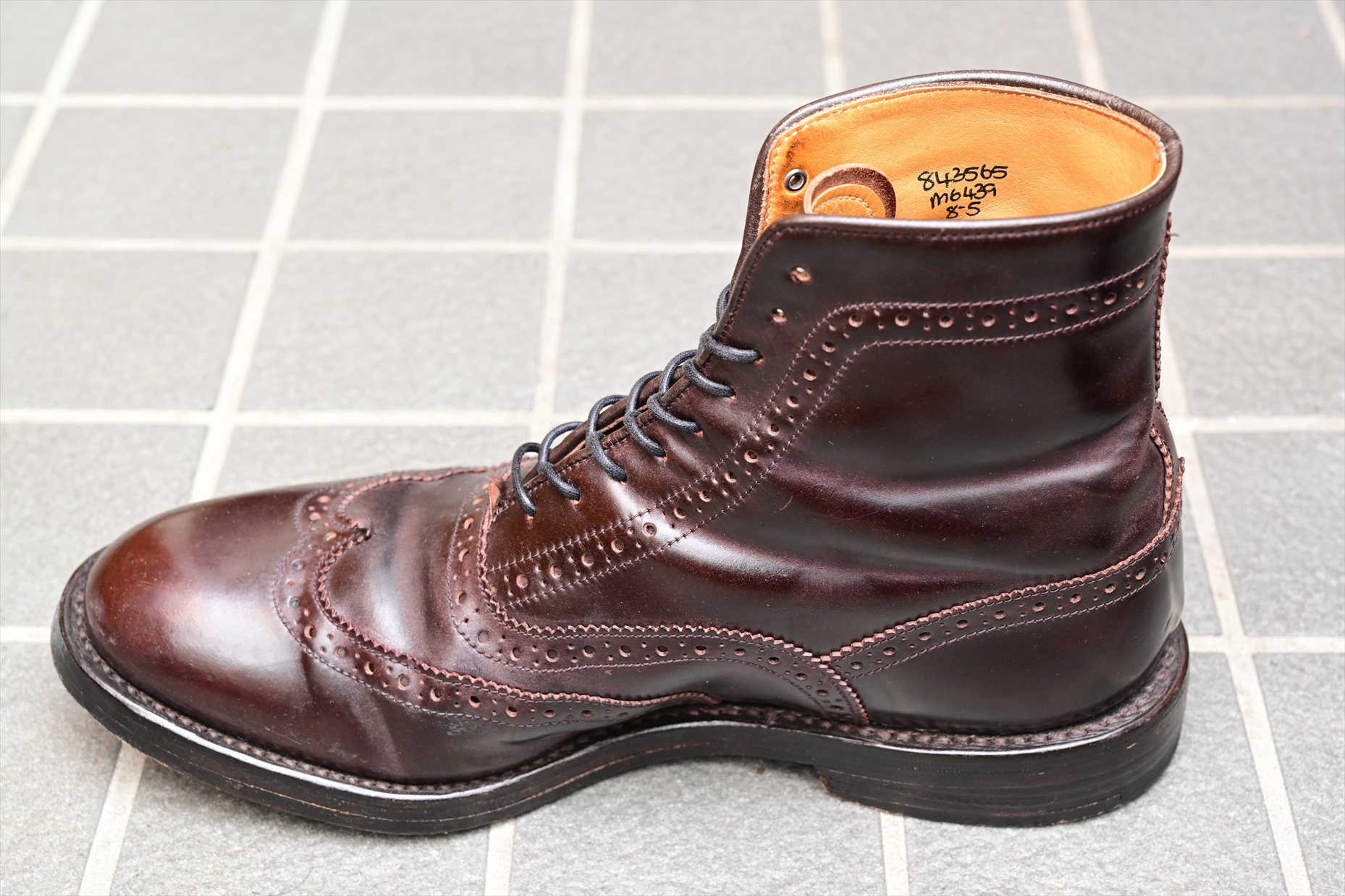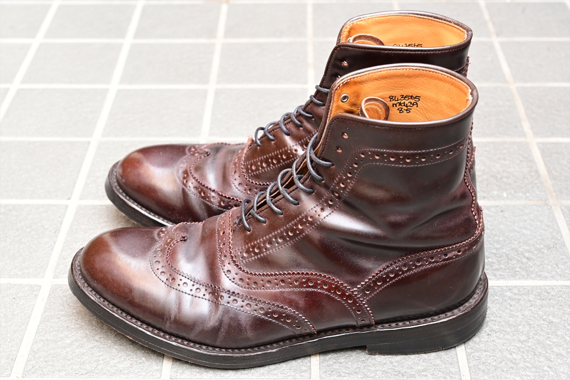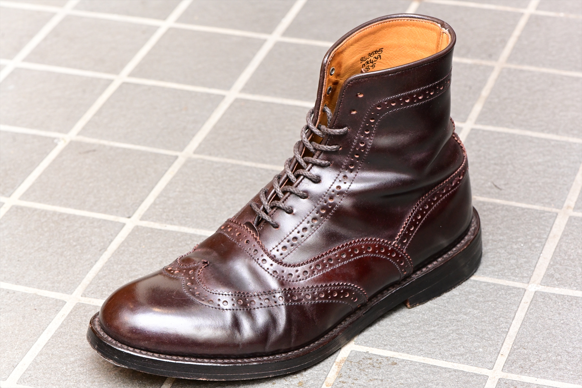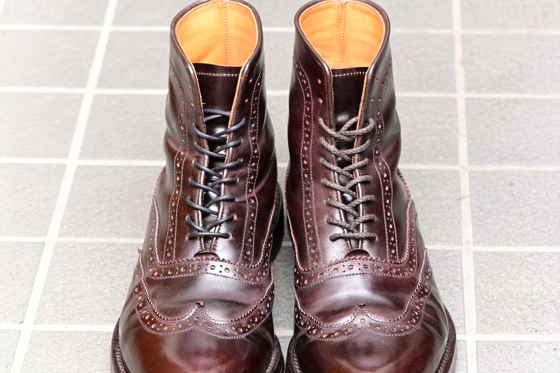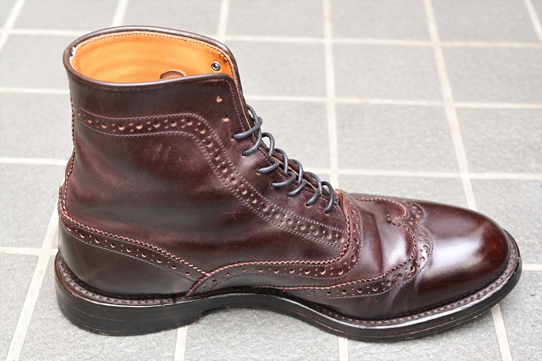 少々寂しい感じもあるが通常のフルブローグよりも上品で、光沢の強いコードバンには合っている。さすがにガラスレザーのような均一な艶とはいかないのだが、コーティングされていないがゆえに履き皺がヒビにならず、小傷であれば磨き直して消せるのはいい。