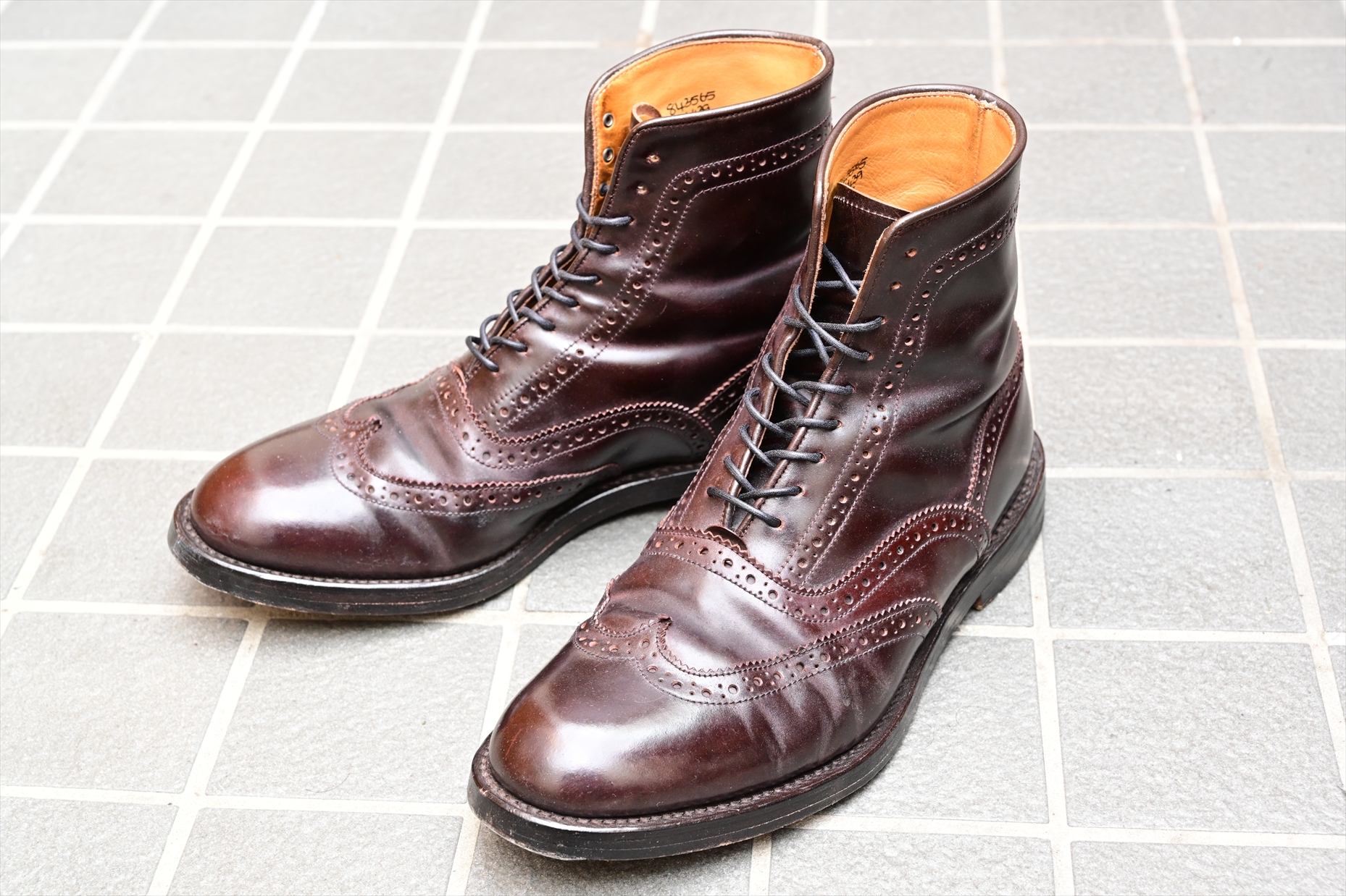 この靴も一見するとオーソドックスなフルブローグのカントリーブーツに見えるが、アッパーレザーが何とコードバンでできている。ディティールも通常のストウやモールトンよりもドレスに振っているため、通常モデルとは異なる風合いを楽しめる。